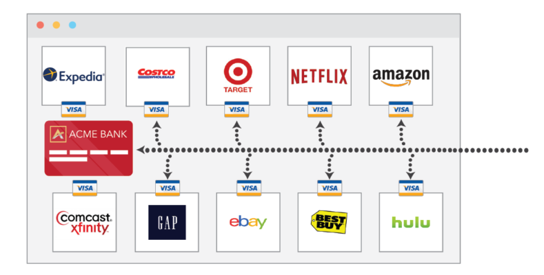 The only drop-in, card-on-file C/X component which instantly updates your cards where your cardholders shop and make payments online – making your card Top of Wallet® on 100’s of online payment sites.